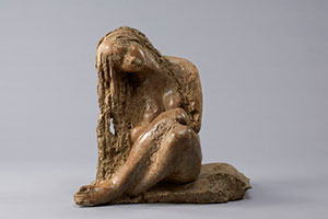 北茨城市出身の彫刻家・蛭田二郎さん(岡山市在住)は茨城大学卒業後、彫刻家・小森邦夫(1971-1993)に師事しました。岡山大学で教鞭をとりながら日展に出品を続け2005年より日本芸術院会員となります。へらなどで大胆に肌を荒らす独特の造形が生み出す愁いやぬくもりを湛えた人物像で、詩情あふれる作品世界を表出しています。